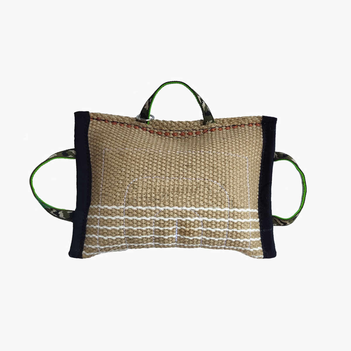 Klin poduszka z trzema uchwytami wykonany z juty, mocnego i trwałego materiału, dzięki swoim właściwościom pozwala psu na wbicie się zębami głęboko bez ryzyka uszkodzenia kłów. Rączki zrobione z wytrzymałej i wygodnej w użytkowaniu taśmy. Dodatkowo wyposażony w metalowe kółko pozwalające przypiąć smycz lub linkę. Klin znajdzie swoje zastosowanie w nauce gryzienia oraz przy pracy nad prawidłowym chwytem psa.