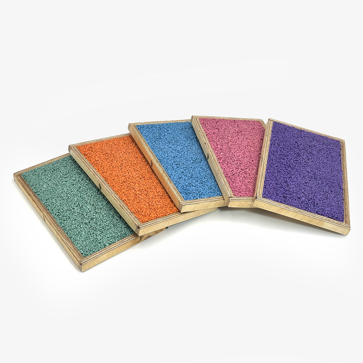 Dostępne kolory tartanu: fioletowy, różowy, niebieski, pomarańczowy, turkusowy.