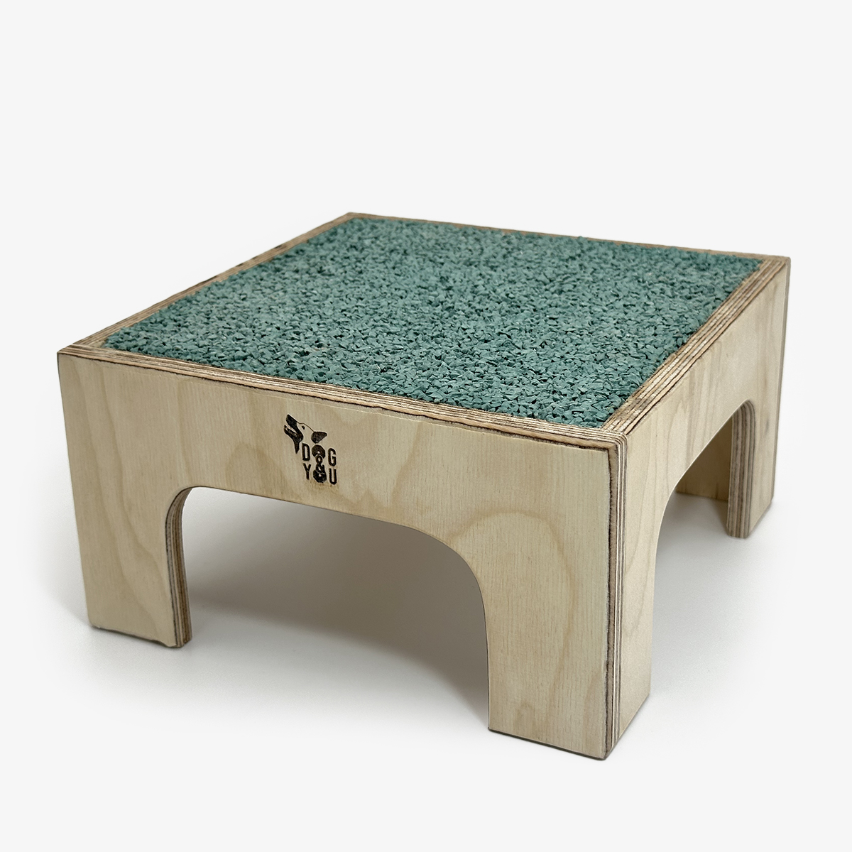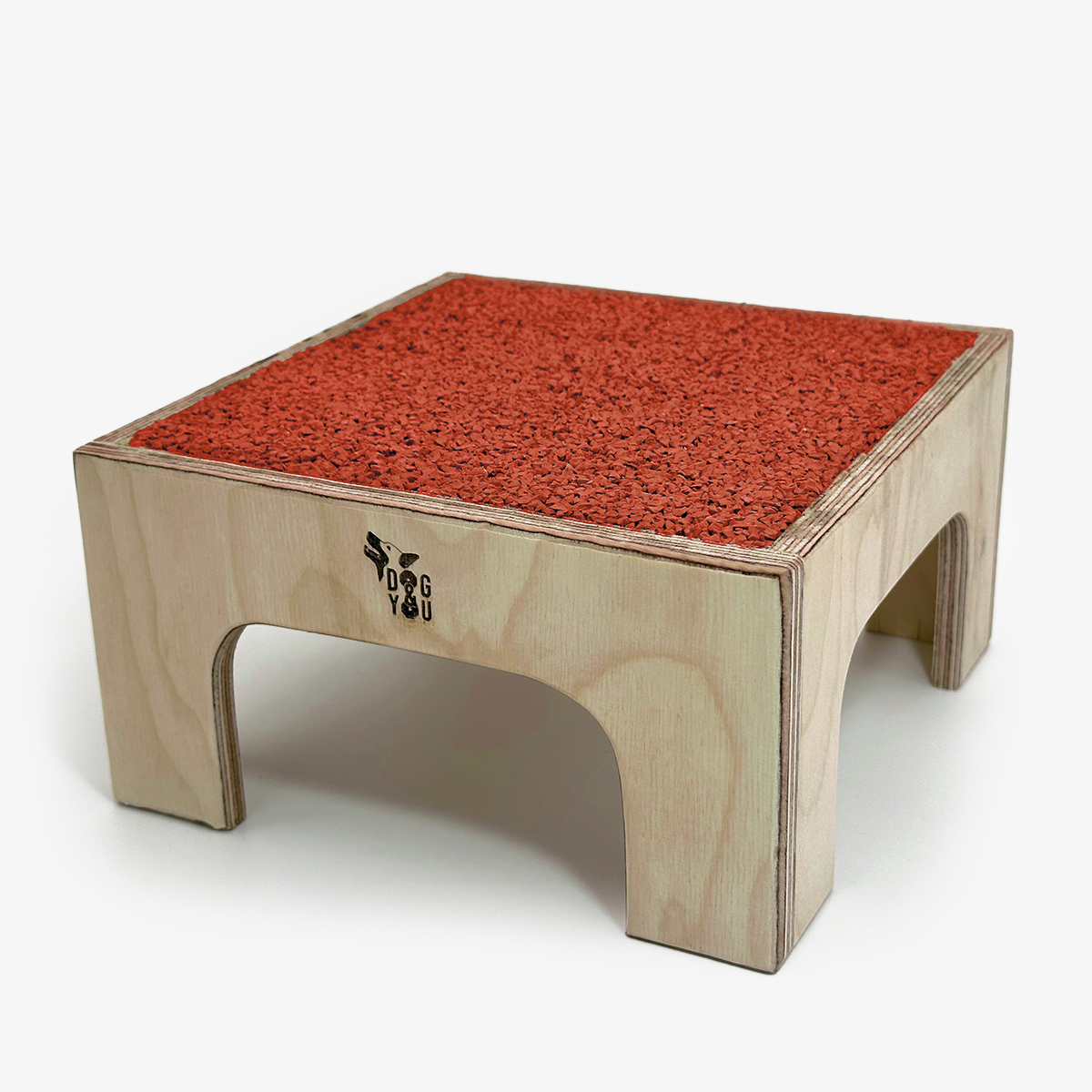 Podest dla psa zrobiony z wodoodpornej sklejki i kolorowego tartanu.