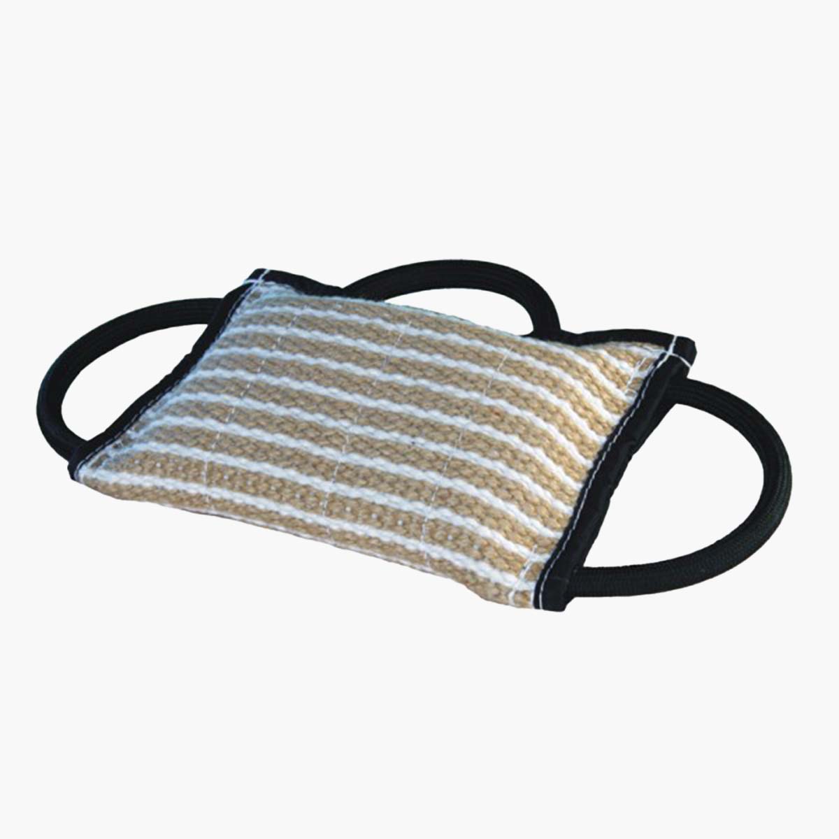 Klin dla psa jutowy z trzema uchwytami wykonany z mocnego i trwałego materiału, dzięki swoim właściwościom pozwala psu na wbicie się zębami głęboko bez ryzyka uszkodzenia kłów. Niezastąpiony w nauce gryzienia oraz przy pracy nad prawidłowym chwytem psa. Wykorzystywany w początkowych etapach nauki obrony.