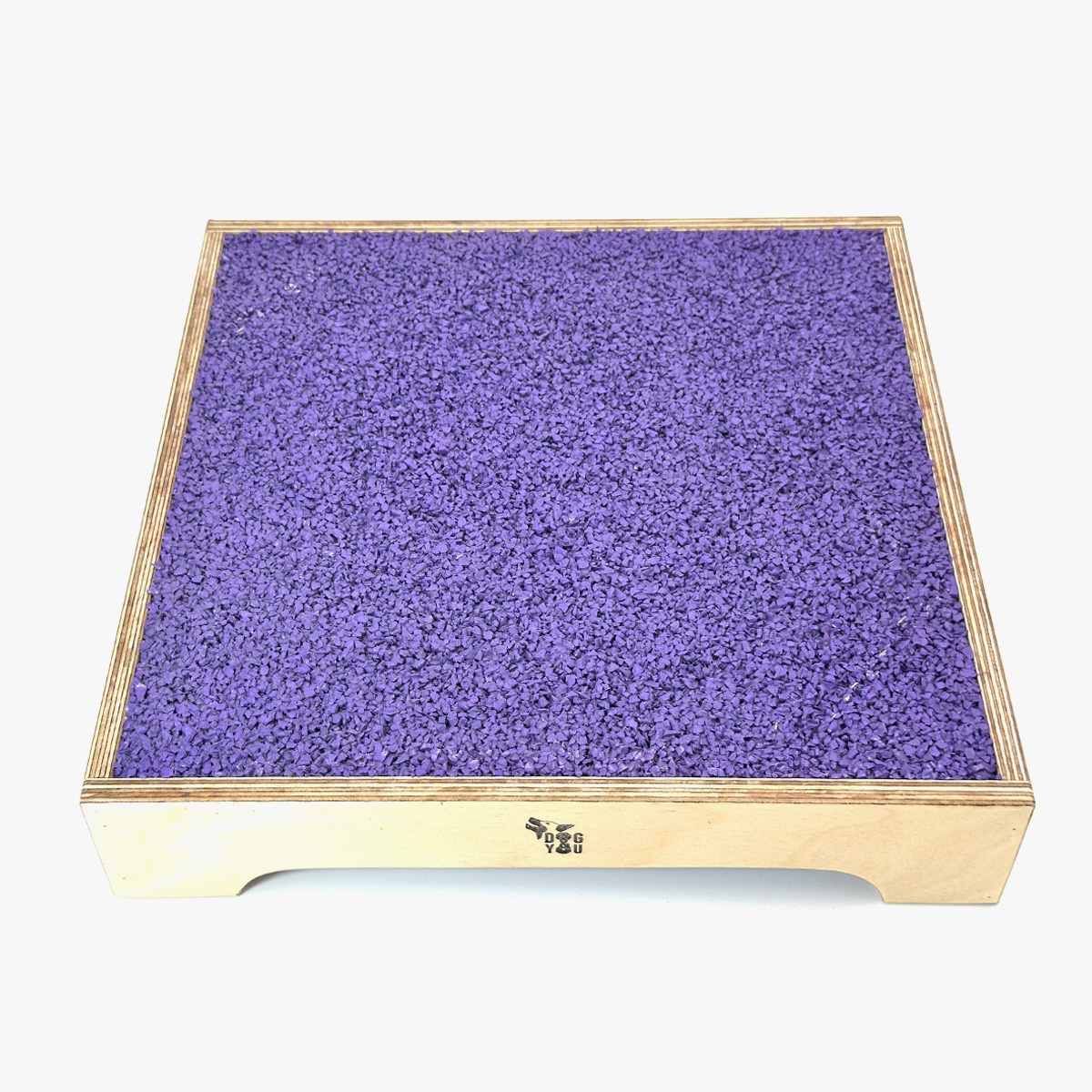 Kwadratowy podest dla psa zrobiony z wodoodpornej sklejki i kolorowego tartanu.