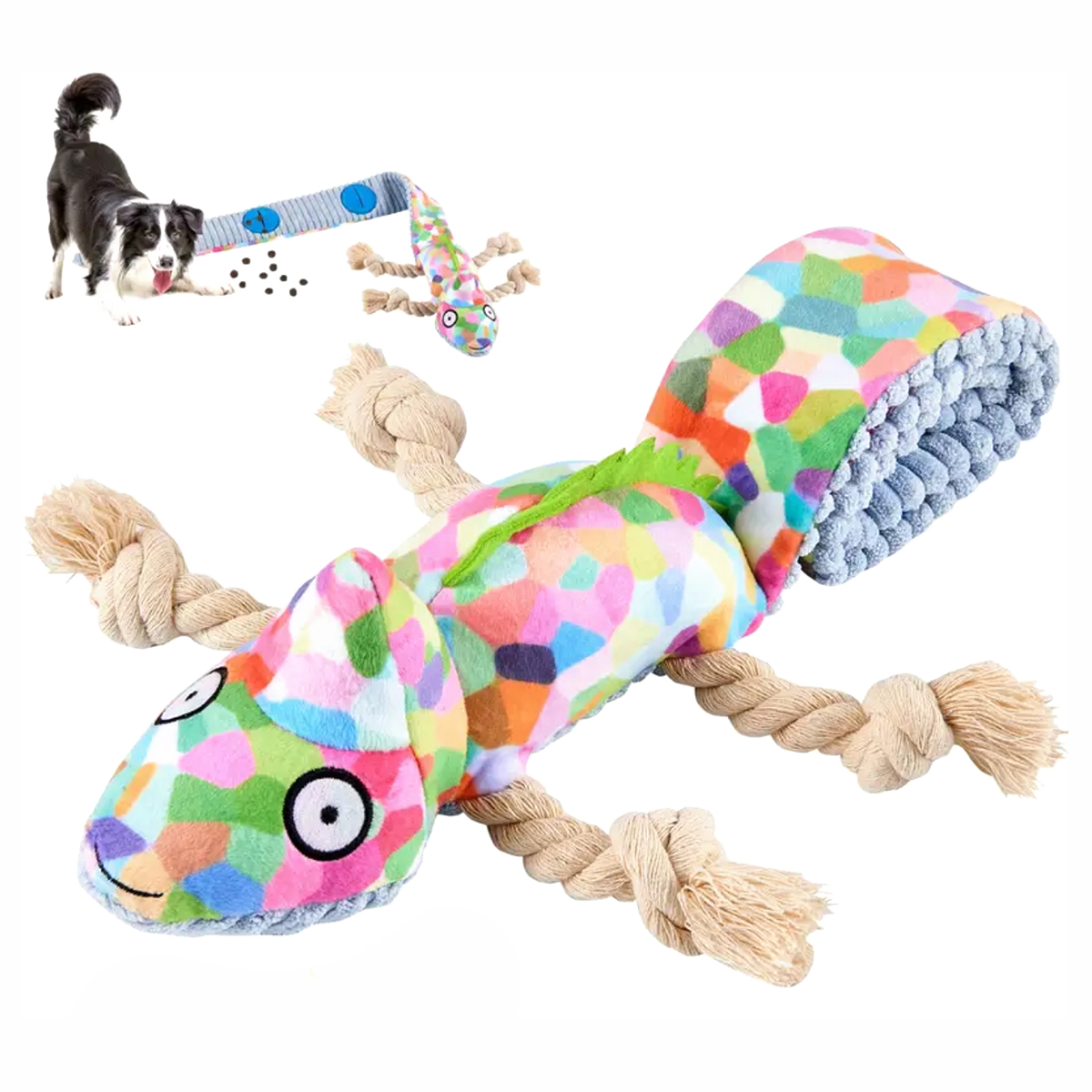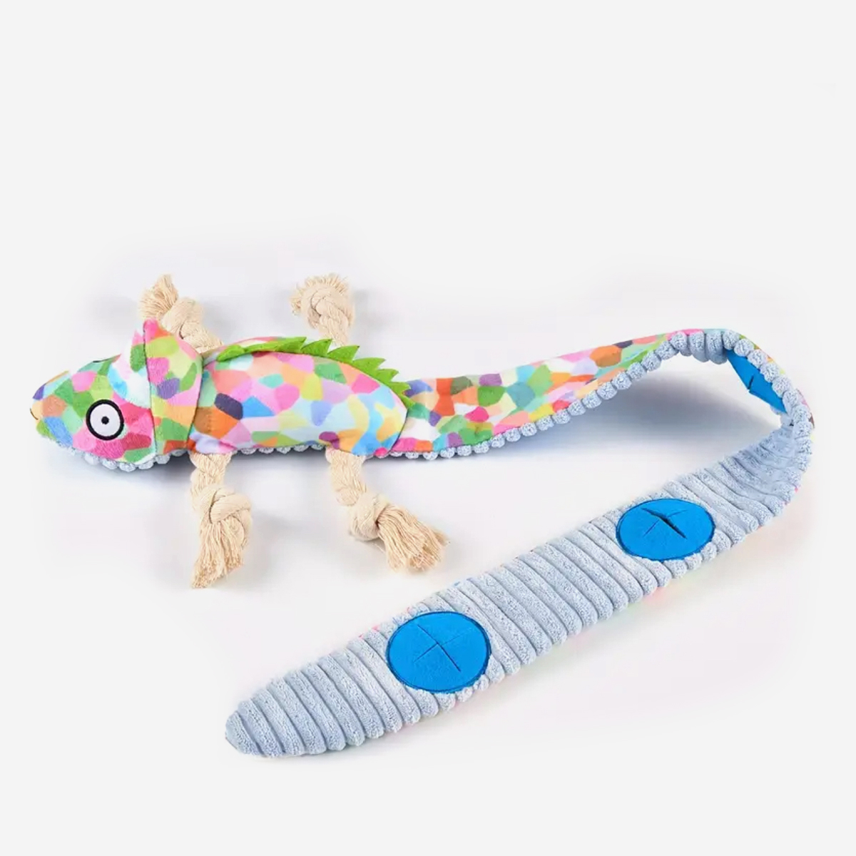 Zabawka dla psa w kształcie kameleona z piszczałką w środku. Miękka i wytrzymała na gryzienie.